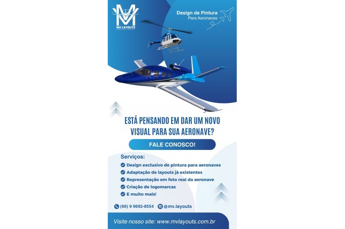 Descrição dos Serviços Oferecidos : Com mais de 4 anos de experiência no mercado aeronáutico, desenvolvo projetos personalizados que unem criatividade, elegância e identidade visual, sempre com foco em destacar cada aeronave de forma única. Meus serviços incluem: ✈️ Designs exclusivos de pintura para aeronaves — criações únicas e personalizadas para cada cliente. 🎨 Adaptações de layouts já existentes — atualização e modernização de pinturas mantendo o estilo desejado. 🖼️ Design em foto real da aeronave — visualização realista do projeto antes da aplicação, proporcionando segurança na escolha do design. 💻 Design em 3D da aeronave — representação tridimensional que permite ao cliente visualizar o projeto em vários ângulos, dependendo do modelo da aeronave. Baseado no Brasil, realizo projetos para clientes e empresas, oferecendo soluções visuais de alto padrão para pintura e identidade aeronáutica. Cada projeto é desenvolvido com atenção aos detalhes, equilíbrio estético e harmonia de cores, garantindo um resultado visual marcante e profissional. Entre em contato e conheça como posso transformar sua aeronave em uma verdadeira obra de arte nos céus. Atenciosamente, Marcos Vinícyus Designer Aeronáutico & Fundador — MV LAYOUTS Aircraft Design 📧 mvlayouts@gmail.com 📱 +55 66 99692-8554 🌐 www.mvlayouts.com.br